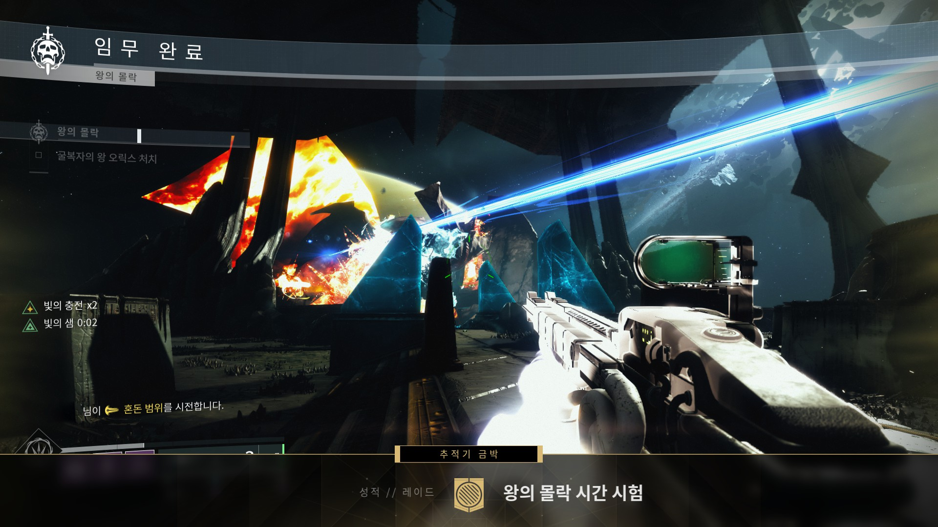 데스티니 가디언즈에는 레이드 출시 날 24시간(한국 기준 새벽2시 - 다음 날 새벽 2시)안에 누가 먼저 클리어를 하는지 겨루는 '데이 원'(Day 1)이라는 축제 대회...가 있습니다. 난이도는 모두에게 똑같도록 고정되고 버그가 발견된 무기는 사용금지 당하기도 하고요.